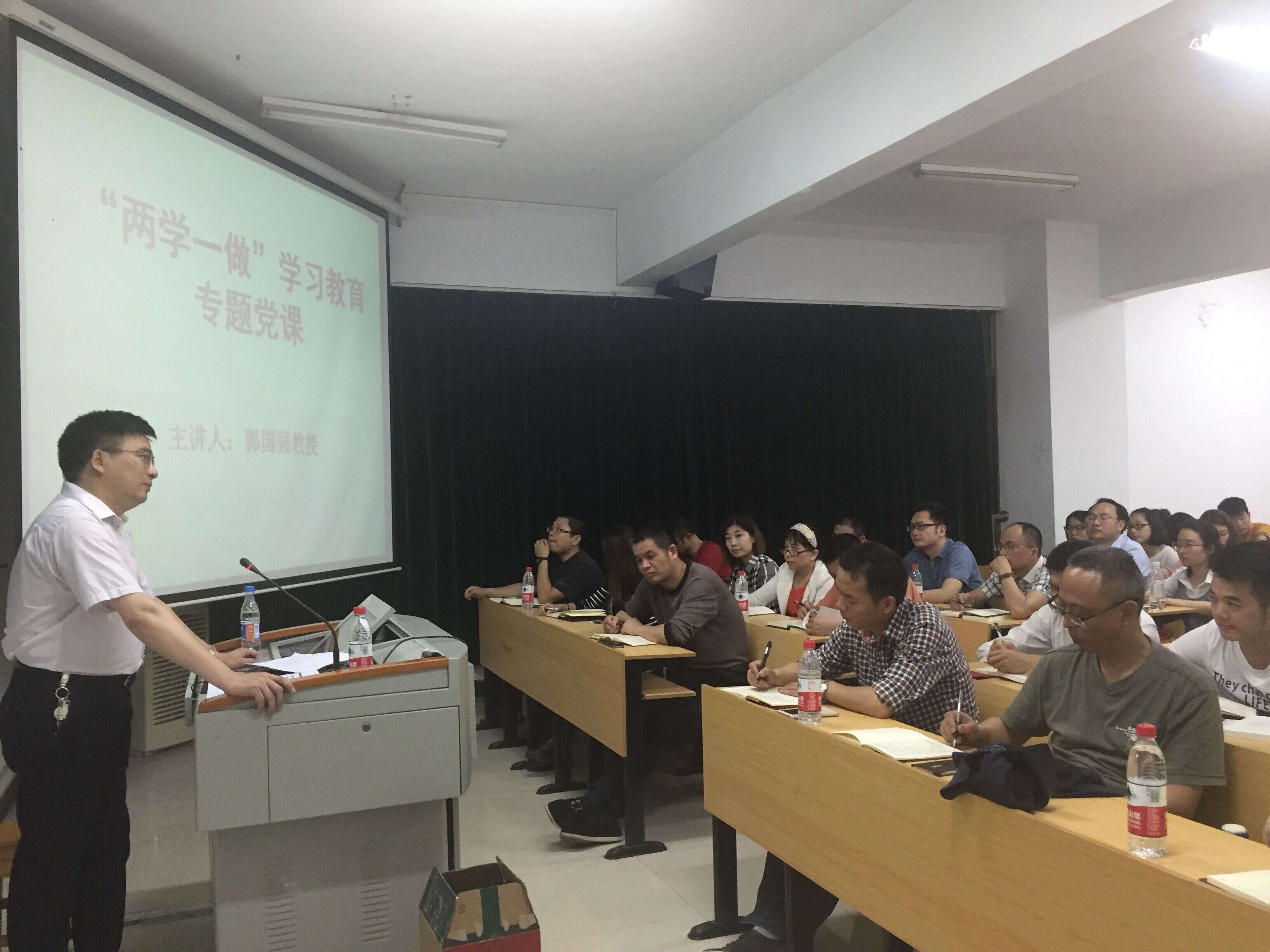 三是精心上好党课。5月20日下午,党总支书记王文杰给学院全体党员上了《学做统一,做四讲四有合格党员》的专题党课;5月24日晚上八点,郭国强副校长在E3A613给我院全体党员上了一堂《坚定中国自信、实现中国梦》的专题党课。郭校长生动阐述了中国自信的力量、原因、“三位一体”中国自信的内涵,在此基础上实现伟大复兴“中国梦”,他希望在目前学校转型试点改革和申硕的关键期,全体党员要立足岗位,勠力同心,人人参与,积极投身学校转型发展和申硕工作的事业中去。
